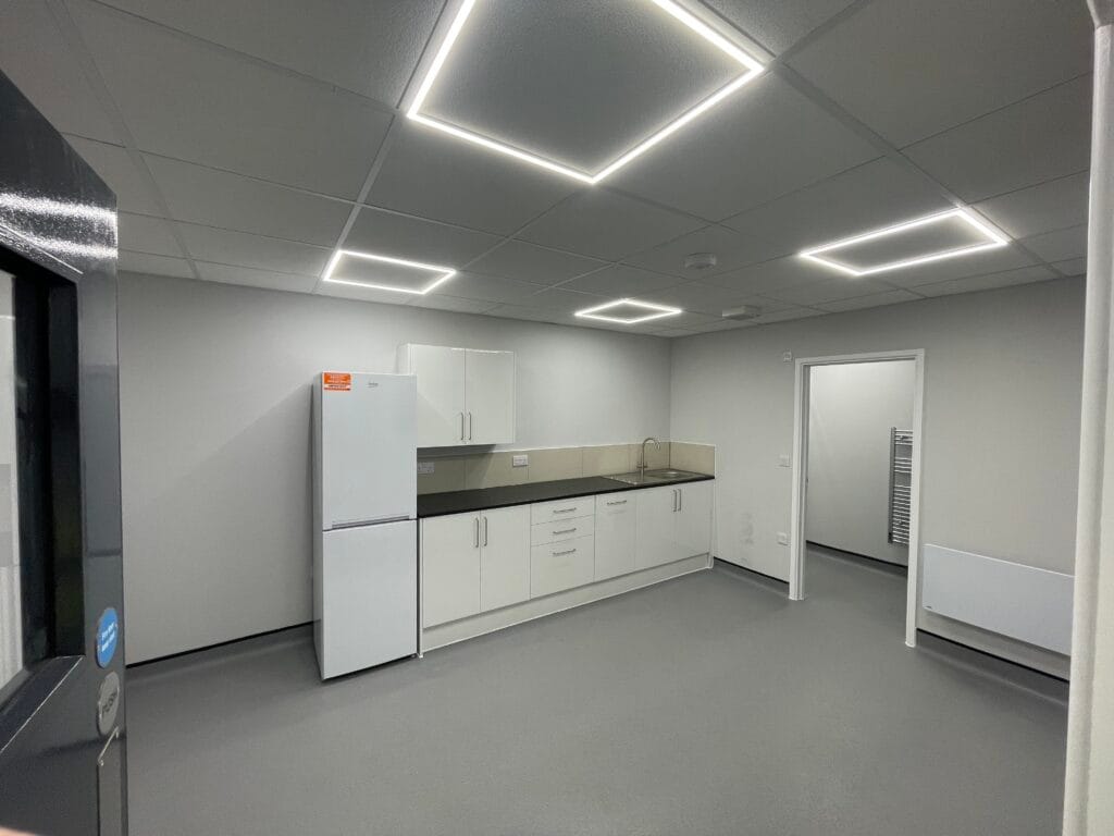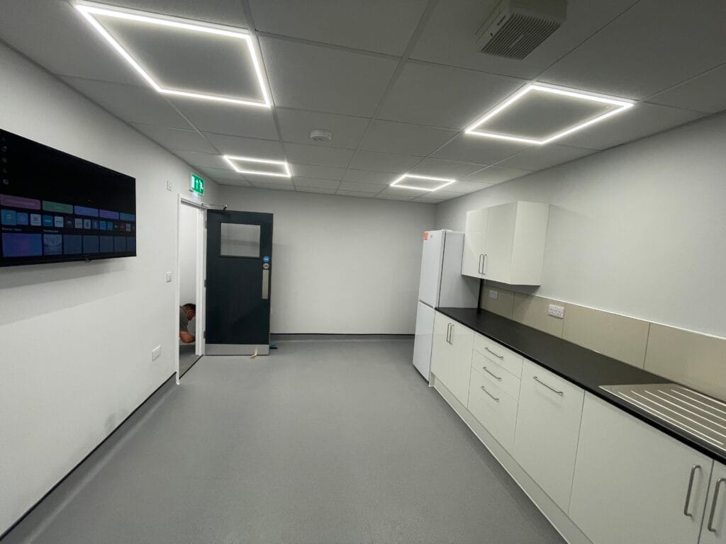 • Modern office refurbishment with integrated kitchen, changing areas, and LED lighting
